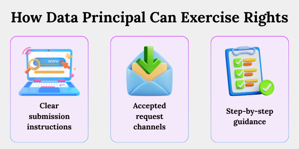 Data Fiduciaries must clearly explain how a Data Principal can submit a rights request. This removes guesswork and ensures individuals are not dependent on informal or undocumented processes. - Clear identity verification requirements