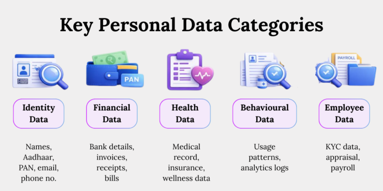 Includes KYC documents, payroll files, appraisal records, and internal identifiers. Employee data is personal data and fully covered under DPDP.