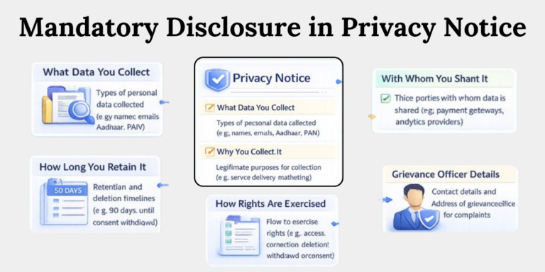 A privacy notice is a legally binding transparency document under DPDP. It must accurately reflect how personal data is collected, used, retained, and shared. Mismatches between notice and actual operations create direct non-compliance and reputational risk.